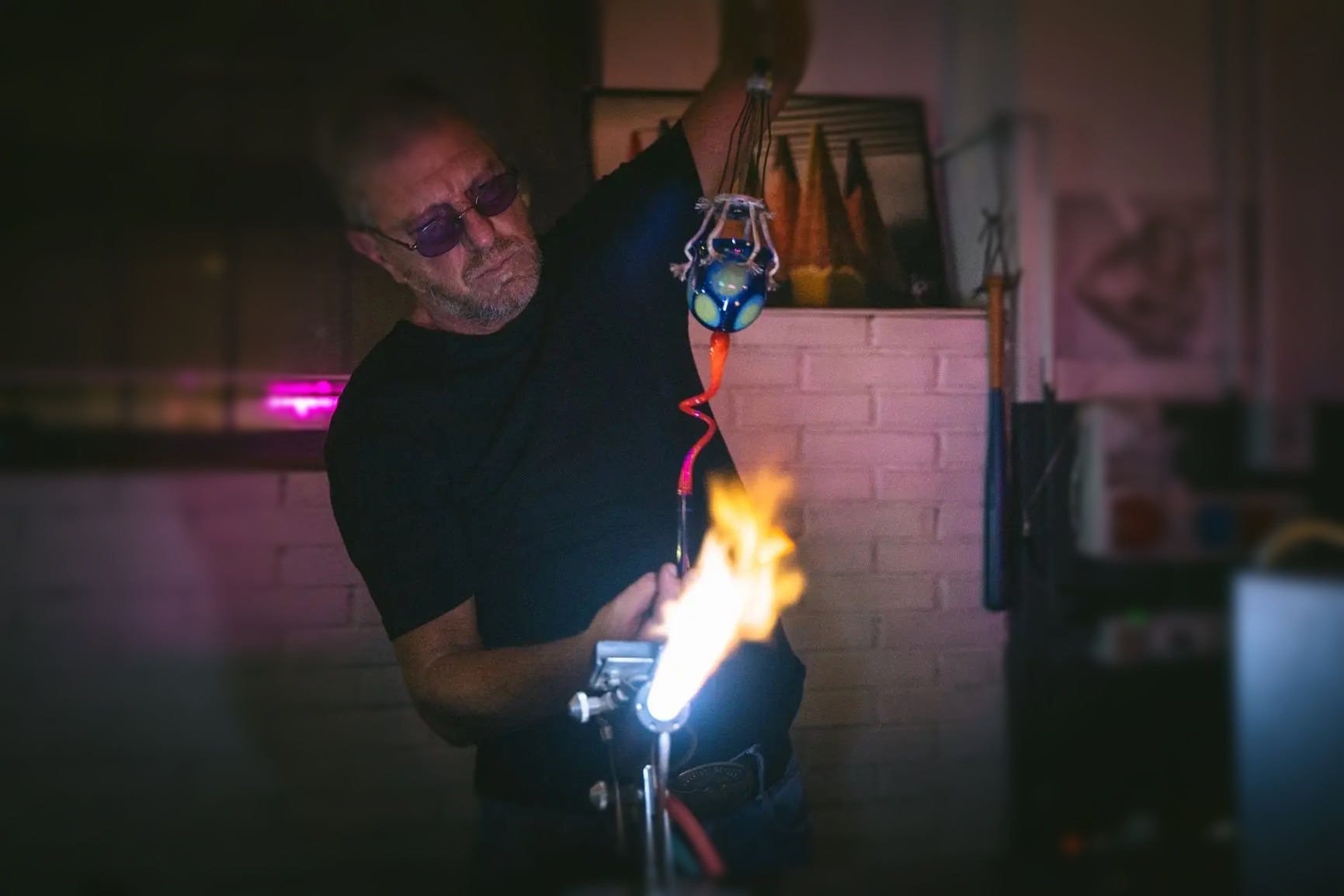 Davide Penso glass blowiong murano glassDavide Penso blowing on torch murano glass
